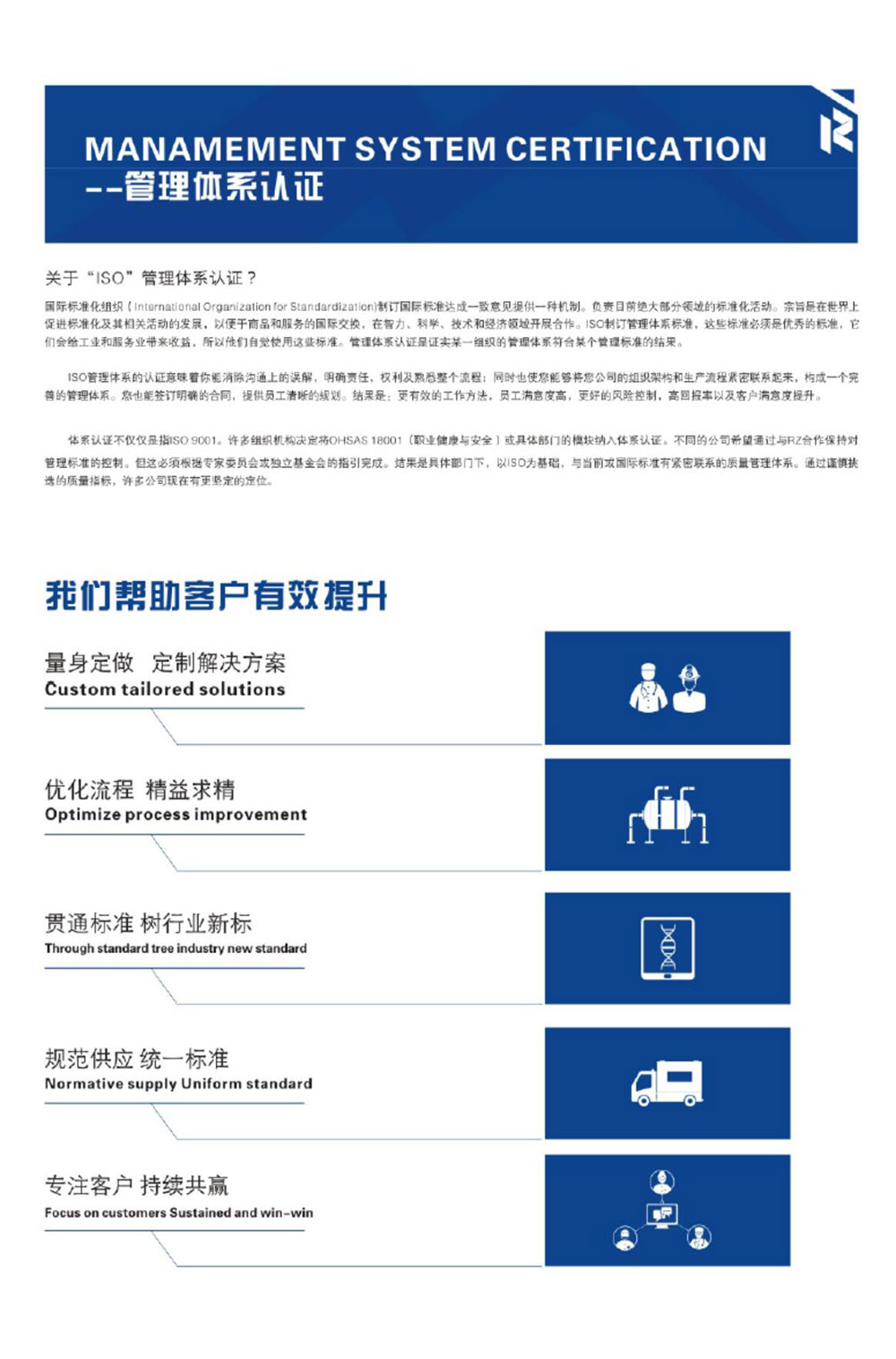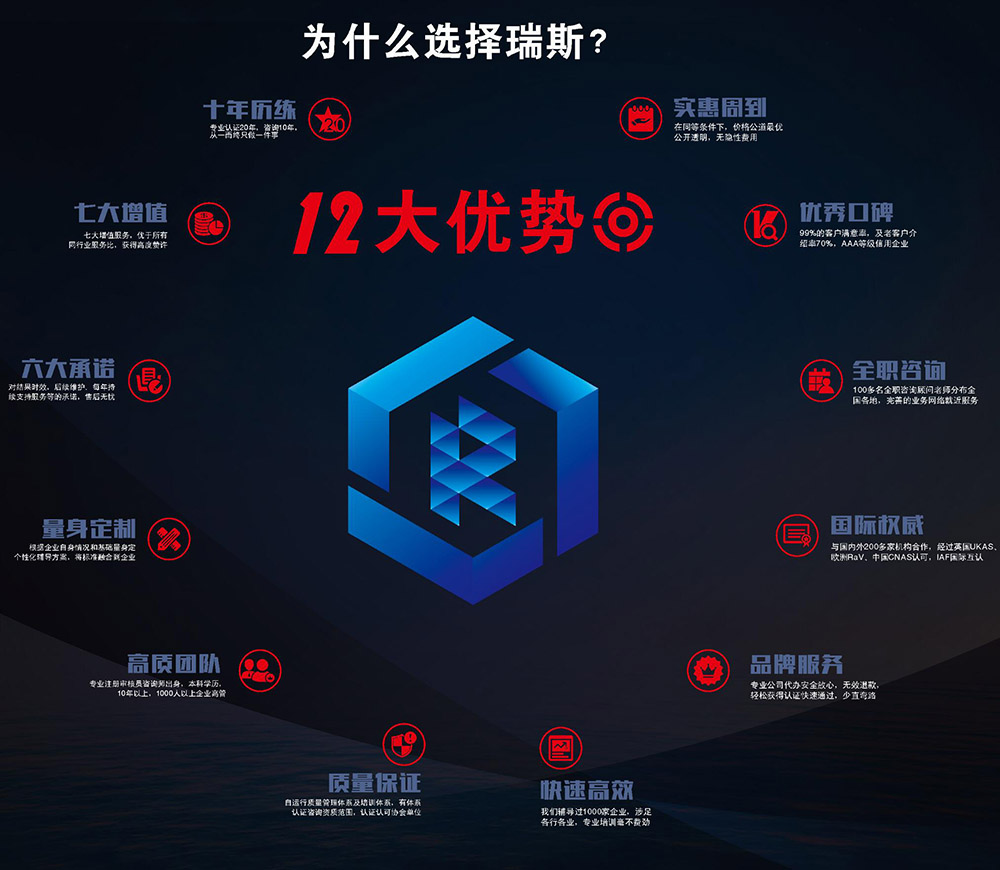 佛山市瑞斯認證技術有限公司(RZ-ISO)是專業化從事認證咨詢培訓服務的第三方認證機構,本著“以人為本,全心、全速、優質”的原則,為客戶提供增值的認證咨詢服務,為企業搭建體系服務;一直積極保持在中國認證輔導領域的領先地位。